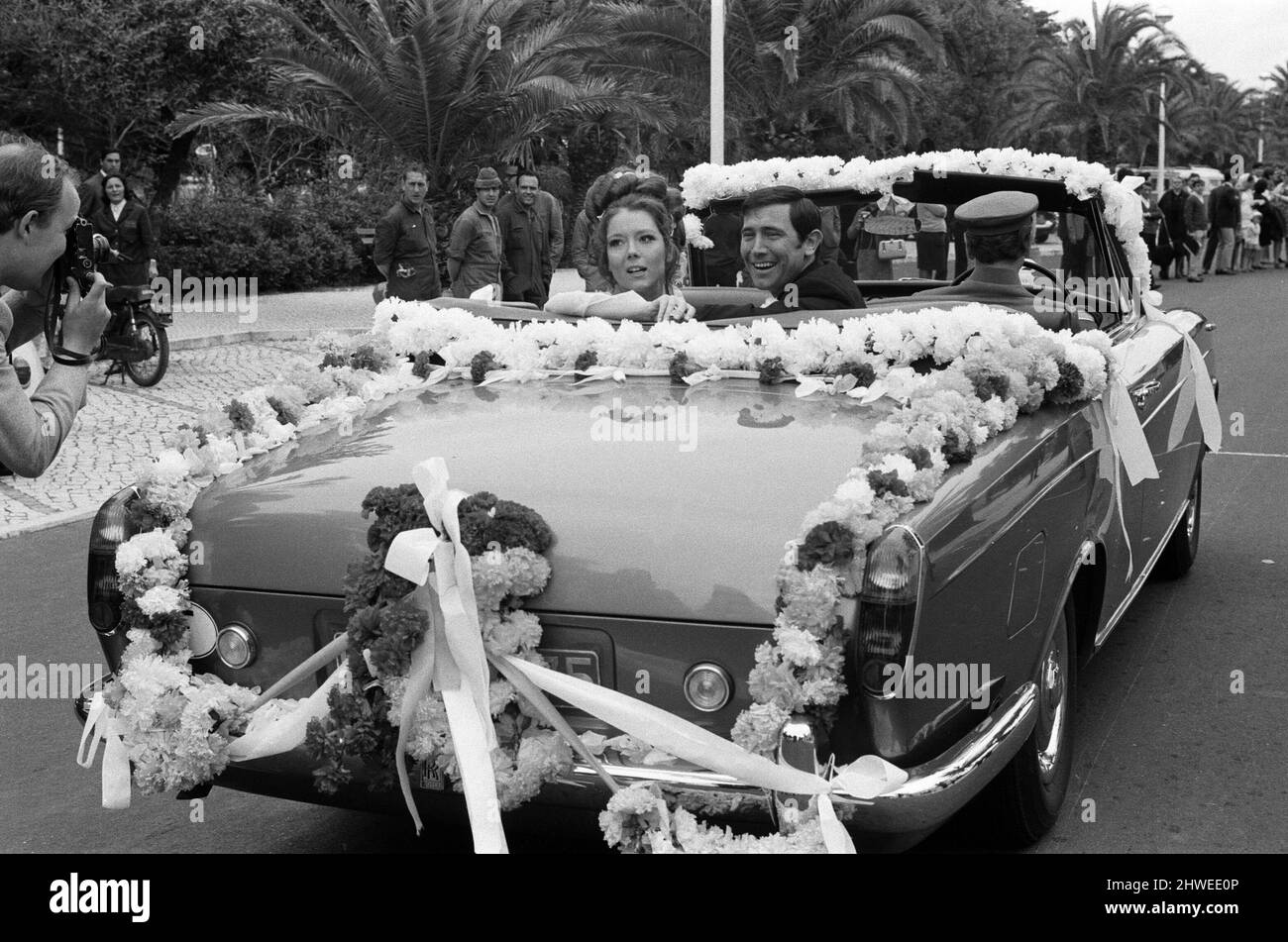 James Bond Gespielt Von George Lazenby Abgebildet Die Hochzeit Von Tracey Gespielt Von Diana Rigg Wahrend Der Dreharbeiten Zu On Her Majesty S Secret Service Estoril Portugal 30 April 1969 Stockfotografie Alamy